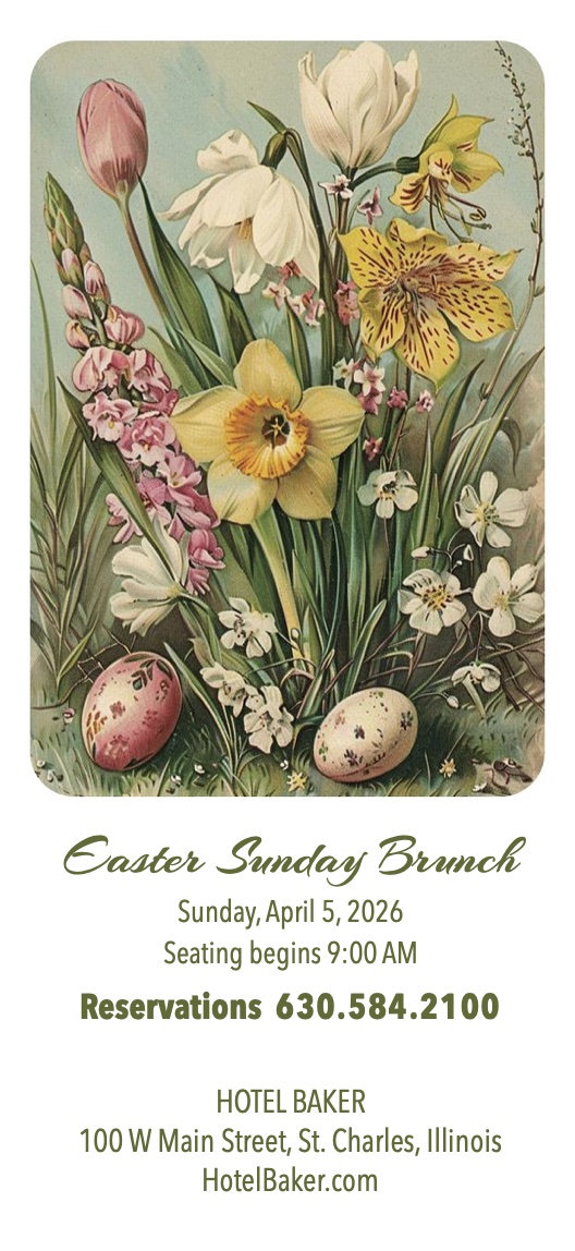 You’re invited to share a festive Easter Brunch in special Hotel Baker fashion. Join us on Sunday, April 5 to enjoy seasonal delicacies, delicious desserts, and celebratory cocktails. Click HERE for more information and call 630.584.2100 to reserve your spot today.